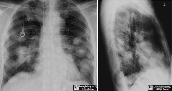 Cavitary Metastases to the Lung. Frontal and lateral chest radiograph (above) show multiple masses