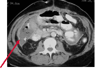 from outside. The CT shows an abscess from a ruptured appendix.